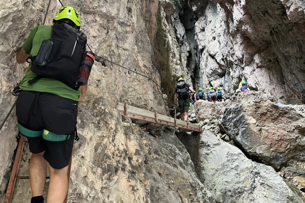 Ablauf: In der Schlucht beginnt der eigentliche Klettersteig – ein abwechslungsreicher Anstieg entlang von Stahlseilen, Trittbügeln und Leitern, der sich durch die enge Felslandschaft windet. Immer wieder geht es über große Felsblöcke, die als natürliche Brücken über den Wildbach dienen.