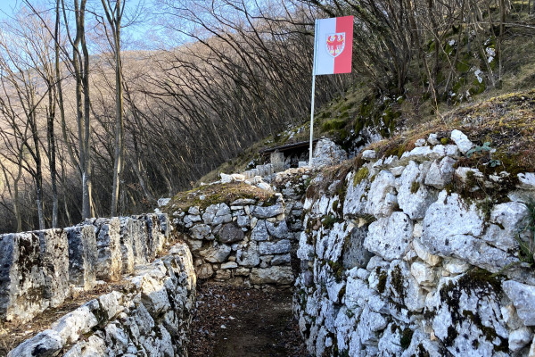 Kurz darauf beginnt der dichte Steineichenwald, der das Landschaftsbild prägt. Im weiteren Verlauf tauchen die ersten historischen Relikte auf: Fuciliere, alte Feuerstellungen, und die restaurierten Schützengräben des k.u.k.-Heeres, die vom Ersten Weltkrieg erzählen. Nach rund 40 Minuten ist der Kastanienhain von Monte Corno (400 m) erreicht – ein stiller Ort mit Weitblick.