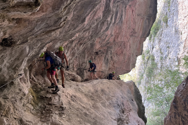 Entrati nella gola, inizia la vera e propria ferrata: Un itinerario avvincente attrezzato con cavi, pioli e scalette che risale la forra, attraversando il torrente su imponenti massi. Il percorso culmina in un’apertura spettacolare dominata da una maestosa cascata, che rende l’esperienza ancora più suggestiva.