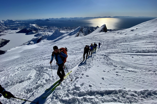 Giornata dedicata a Rundfjellet, una cima dalle linee armoniose che offre pendenze ideali per una salita fluida e una discesa divertente. Qui il bianco domina tutto e il mare sembra sempre a un passo dagli sci. Salire su questi pendii significa tuffarsi in un silenzio immacolato, interrotto solo dal suono delle pelli e dal respiro. - giorno - Store Kvittind (696 m) – Sci ai piedi dalla porta di casa